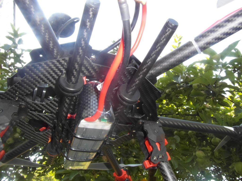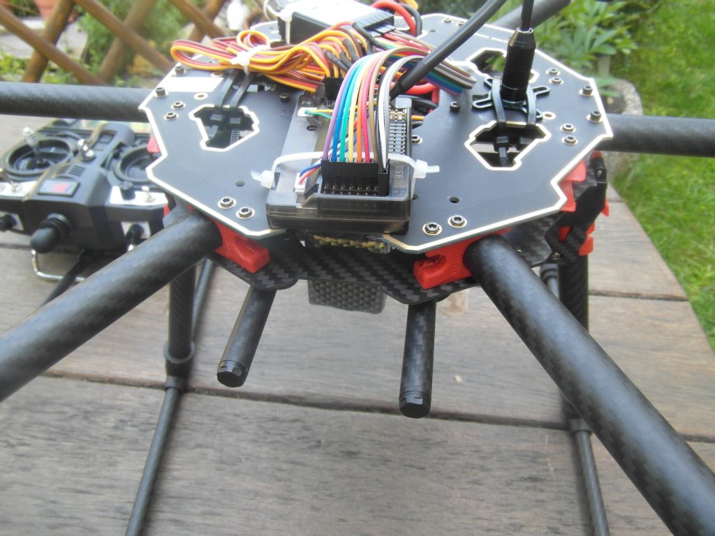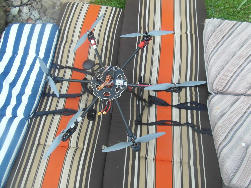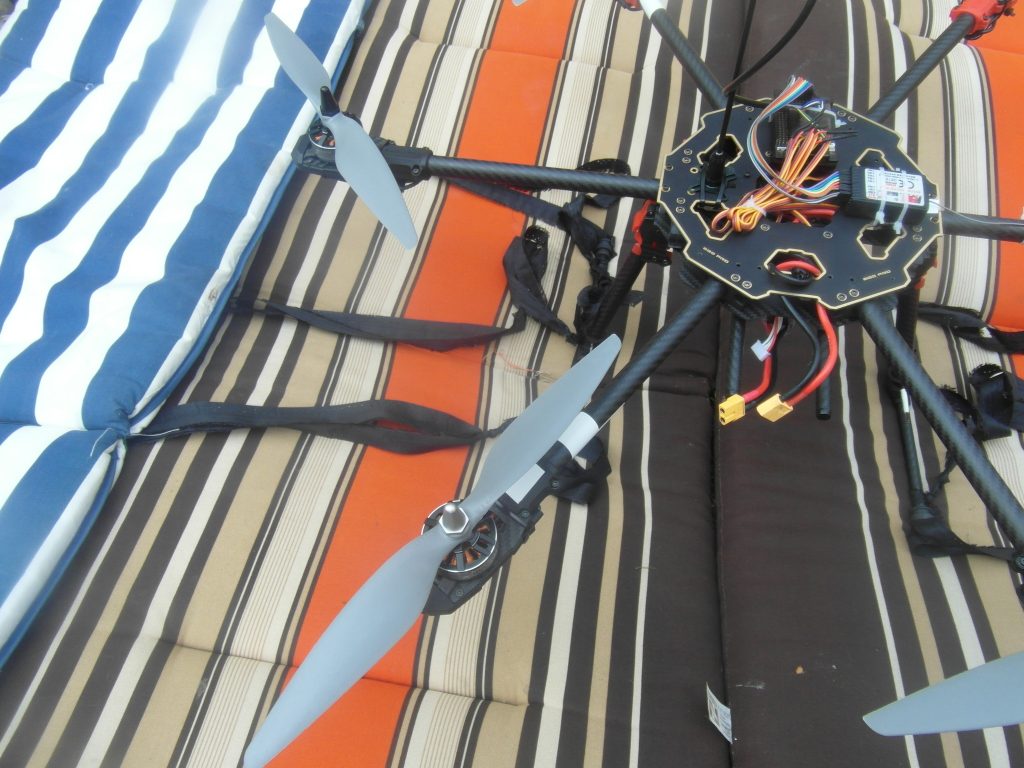 W sobotę około godziny 9 pojechałem do rodziców aby na ich ogrodzie przeprowadzić pierwszy test. Test miał polegać na tym że ojciec trzyma nad głową drona a ja nim kieruję. W sumie wszystko się udało ale … no właśnie ale. Błędy nowicjusza, wiedziałem że śruby mocujące śmigła mają się nie odkręcać ale za słabo je przykręciłem, zrobiłem to rękami. Pierwszy lot i pierwsza zgubiona śruba. Na nieszczęście była do śruba z lewym gwintem o które ciężej. Trudno to tylko śruba ważne że nikomu nic się nie stało. Moja mina jak samo śmigło leci pionowo do góry była pewnie bezcenna. Zrobiłem klucz do przykręcania śrub odcinając z jednej strony już ułamany fragment od 15. Moje śmigła przykręca się kluczem 14. Kolejny błąd nowicjusza? Ustawiłem w dronie domyślny tryb jako LOITER czyli utrzymanie pozycji GPS i momentami miałem problemy z wyłączeniem i zapanowaniem nad silnikami. To może być wina tego trybu ale później doszedłem też do tego aby wyprowadzić antenę z odbiornika poza drona i przyczepiłem ją do jednego ramienia z silnikiem, pomogło.
