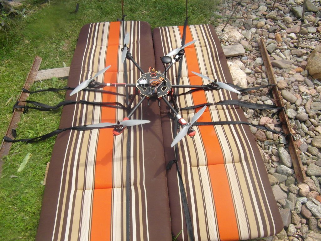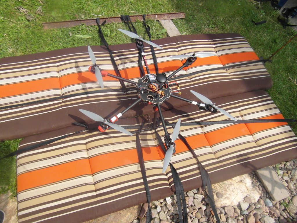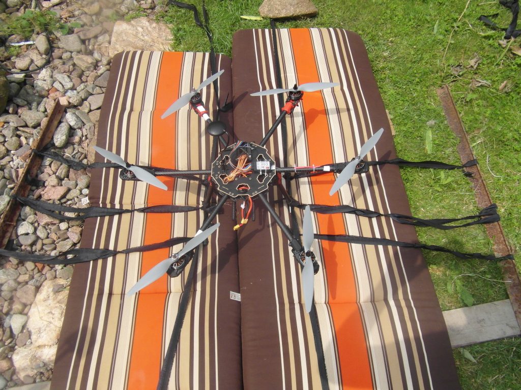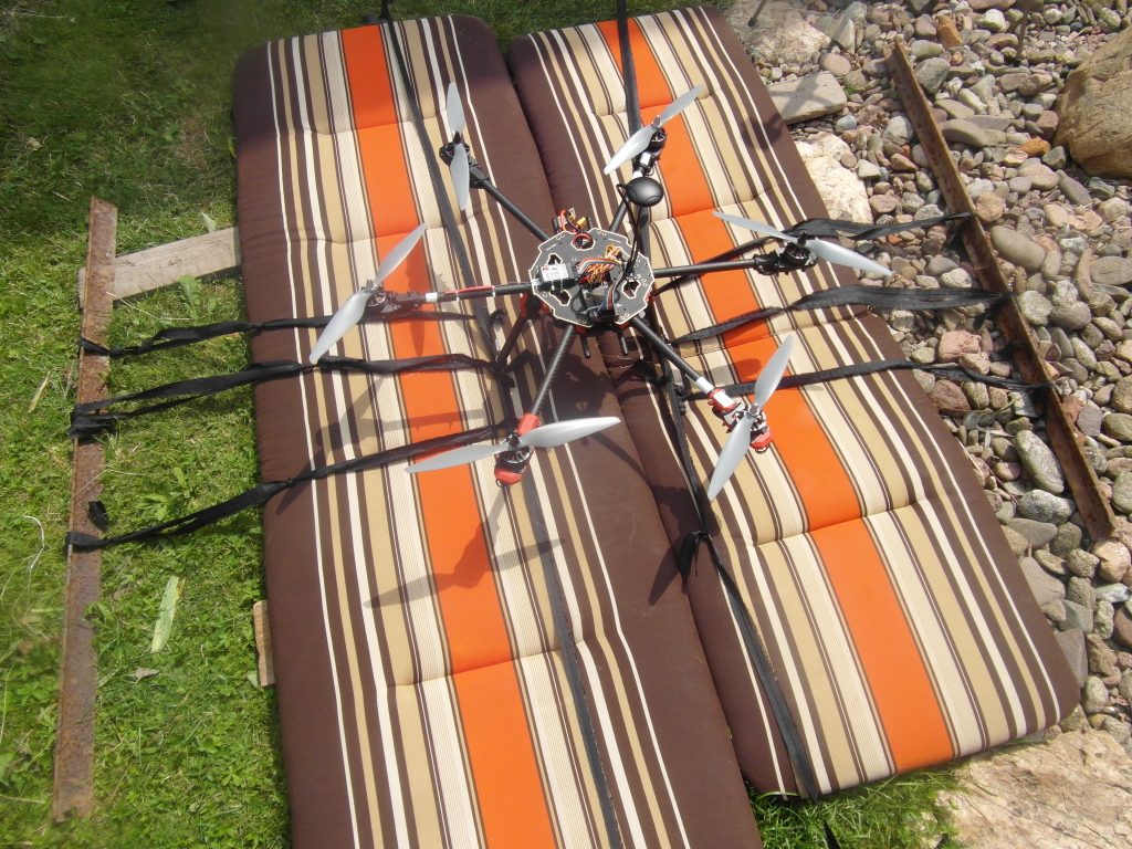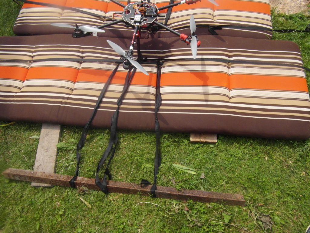 Niedziela to już dzień w którym chciałem oderwać drona od ziemi. Przygotowałem mu miejsce to startu okładając je materacami od mebli ogrodowych. Samego drona przymocowaniem do teowników oraz wbiłem kotwy w ziemie. Tak naprężyłem sznurki aby dron oderwał się na wysokość do 10-15cm. Testy przebiegły w miarę pomyślnie ale więcej postaram Wam się opowiedzieć na filmie który może uda mi się zrobić na ten poniedziałek.